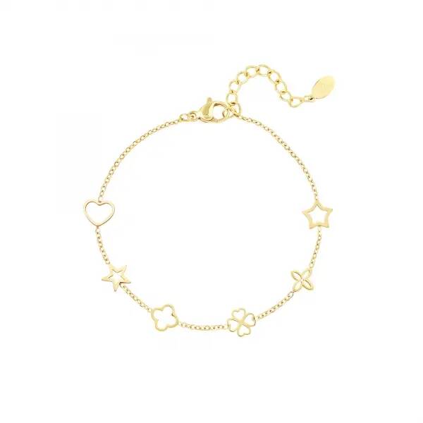 Joli bracelet en or avec plusieurs figures différentes, comme un cœur, une étoile et une fleur. Ce joli bracelet est en acier inoxydable et a une fermeture réglable. Grâce à la fermeture réglable, le bracelet peut être porté de 16 à 19 cm. En plus de l'or, le bracelet est également disponible en argent, achetez votre préféré ou achetez les deux ! Agréable de combiner ce bracelet avec plusieurs bracelets pour une belle fête de bras !