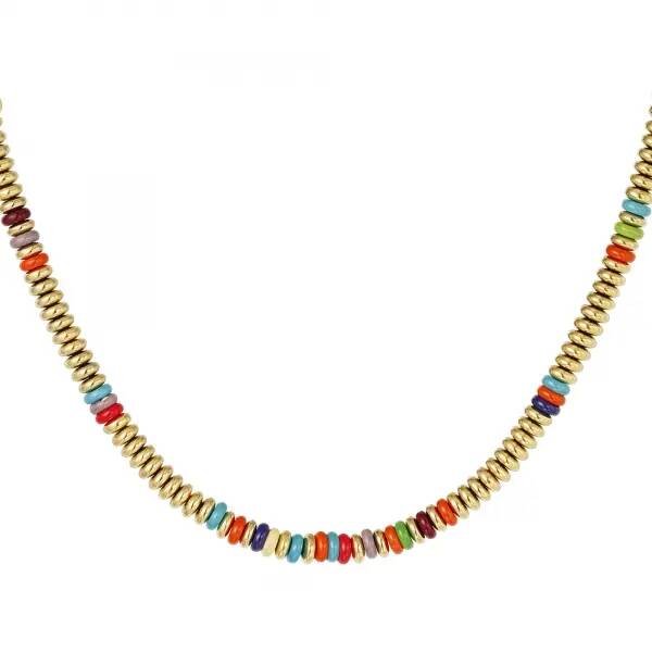 Avec ce collier, vous pouvez vraiment transformer n'importe quelle tenue en fête ! Le collier est entièrement décoré de grosses perles plates; principalement en or avec un certain nombre de couleurs entre les deux. Le collier est composé de turquoise, d'hématite et d'acier inoxydable et a une taille de 39 cm. Grâce aux perles de pierre colorées, le collier peut être parfaitement combiné avec différentes tenues.