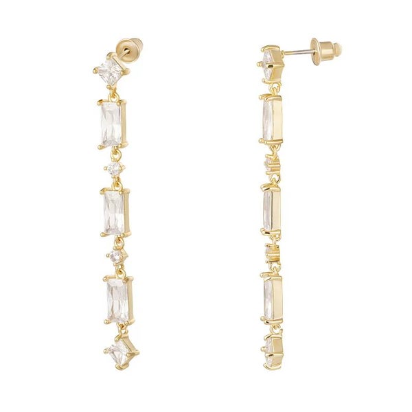 Jolies boucles d'oreilles en argent avec un long pendentif avec des pierres colorées. Les boucles d'oreilles sont en cuivre plaqué or blanc. Ces boucles d'oreilles scintillantes sont incrustées de petites pierres de zircone de couleur blanche. Les boucles d'oreilles mesurent 6 cm de long et 0,5 cm de large. Les boucles d'oreilles pèsent 5,5 grammes.